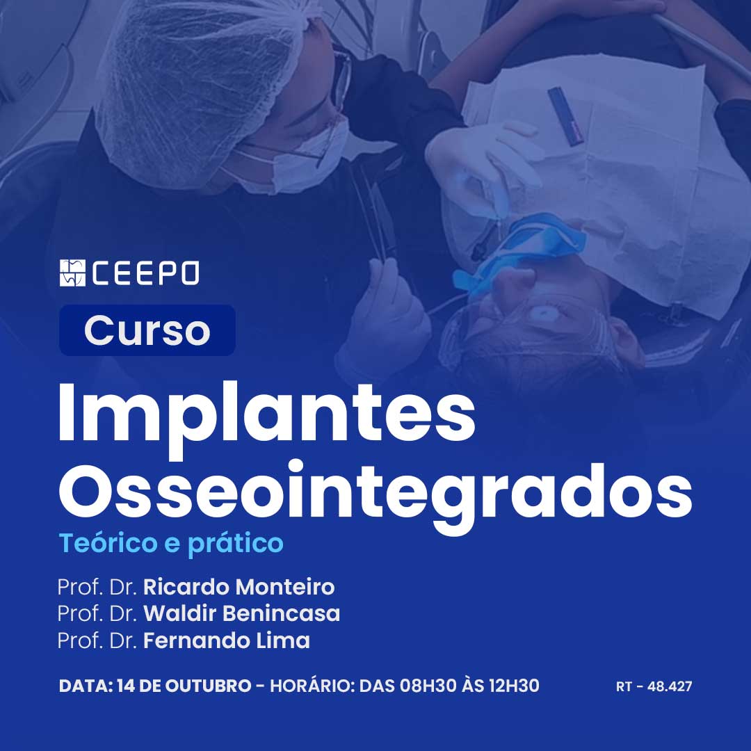 Curso de Implantes osseointegrados no CEEPO. Formação teórica e prática com cirurgias em pacientes e técnicas avançadas de enxertia óssea.